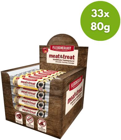 Összetétel : 44% csirke (25% hús, 10% zúza, 9% máj) , 20% gouda, 8% burgonyakeményítő, 6% répapép, 5% durumbúzadaraAnalitikai összetevők: Nyersfehérje: 12%, nyers zsír: 7,4%, nyershamu: 3,5%, nyersrost: 2,2%, nedvességtartalom: 58,9% Kiszerelés: 33x80 g A Meat and TrEat jutalomfalatai nem helyettesítik a terljes értékű táplálkozást!