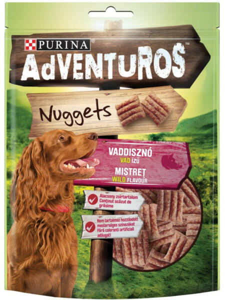 PURINA AdVENTuROS Nuggets jutalomfalat kutyáknak Vaddisznó Purina AdVENTuROS Nuggets vaddisznó, vad ízű jutalomfalat kutyáknak 90 gGabonafélék, Glicerol, Hús és állati származékok (8%)*, Különféle cukrok, Növényi fehérjekivonatok, Növényi eredetű származékok, Ásványi anyagok, Olajok és zsírok, *24% rehidratált hús és állati származákkal egyenértékű, minimum 14%