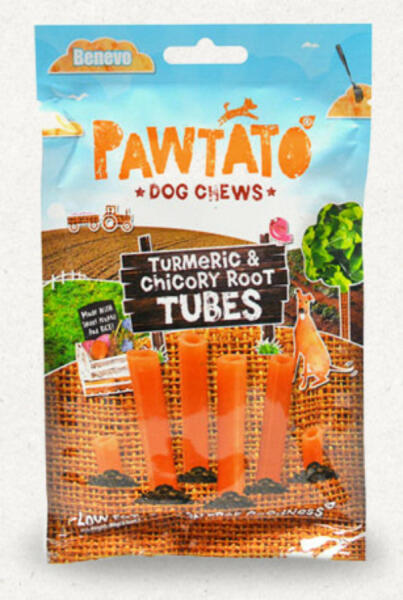 Édesburgonya- és rizs csövek kurkumával és cikóriagyökérrel felturbózva. Alacsony zsírtartalmú, gluténmentes, hipoallergén rágcsálnivaló, mely adható jutalomfalatként vagy snack-ként. A Pawtato növényi pálcikák egészséges és természetes alternatíváját jelentik a marhabőr rágókáknak. A fitonutriensekben gazdag édesburgonya természetes módon tartalmaz rengeteg vi