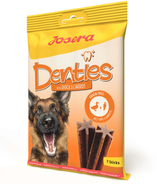 Fogmosás, nagyon ízletesen: az új Josera Denties rágókának köszönhetően a fogmosás lesz kutyánk kedvenc időtöltése! A JoseraDenties Duck & Carrot valódi élvezetet nyújt a fogápolás során, cellulóztartalma segíti a fogak tisztulását, mindezt felülmúlhatatlanul finom kacsával és sárgarépával. Gabonamentes A táp nem tartalmaz gabonát, így kiválóan alkalmas mind