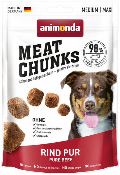 Animonda Meat Chunks (marha) jutalomfalat - kutyák részére (80g) Az animonda® húsdarabok ellenállhatatlanul finomak felnőtt kutyák számára. Ezek a húsos kutya snack csak állati fehérjeforrást tartalmaz, és nem tartalmaz gabonaféléket. A kutya snacket finoman levegőn szárítják, 98% hústartalommal, cukor és szója hozzáadása nélkül. Ily módon még az élelmiszer-érzéken