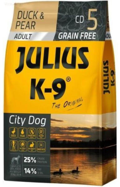 Adult Duck&Pear A Julius K-9 Grain Free Adult City Dog - Duck & Pear egy teljes értékű száraz eledel kacsahúsból készített, gabonamentes kutyatáp. Hozzáadott körtével és glükozaminnal. A sovány kacsahús könnyen emészthető, vasban gazdag fehérjeforrás. A körte A, B1, B2, C, E, K vitaminokban, rézben, káliumban gazdag gyümölcs. A JULIUS-K9 City Dog Kacsa körtével