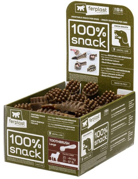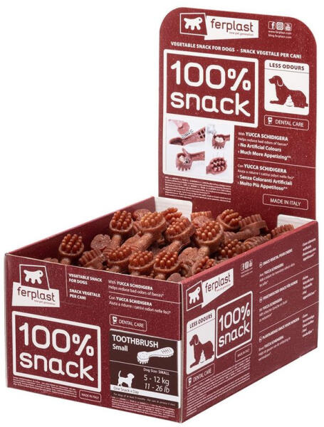 Vegetáriánus fogászati snack kutyáknak. Fogkefe formájú. A 100% Snack a vegetáriánus fogászati rágcsálnivalók teljes választéka kutyák számára, amelyek az innovatív formáknak és hasznos funkcionális összetevőknek köszönhetően minden igényt kielégítenek. Természetesek és egészségesek ezek, a kutyák számára készült vegetáriánus rágcsálnivalók, melyek számo