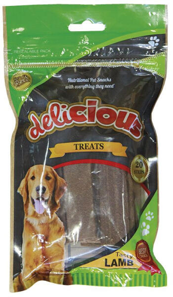 Delicious Meaty strips with lamb 200gKiegészítő takarmány felnőtt kutyák számára. Etetési javaslat: felnőtt kutya számára mérettől függően 1-8 db / nap. Összetevők: válogatott gabonafélék, hús és állati melléktermékek, növényi származékok. Tápértékkel rendelkező adalékanyagok (/kg): Vitamin A 5000 IU, Vitamin D3 500 IU, Vitamin E 50 mg, kálcium karbonát 1000mg.
