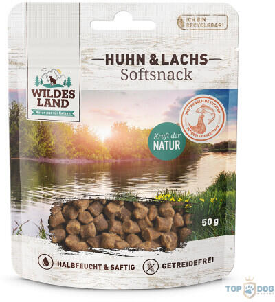 Félnedves és lédús, Magas hústartalommal, Gabonamentes recept, Cukor-, szín- és ízesítőmentes, 100%-ban Svájcban készült, Újrahasznosítható csomagolás, Fedezze fel a finom Wildes Land Softsnack Chicken & Salmon-t, és jutalmazza meg macskáját egy különleges finomsággal. A magas, 18%-os nedvességtartalom, valamint a friss csirkehús és lazac magas aránya különösen j