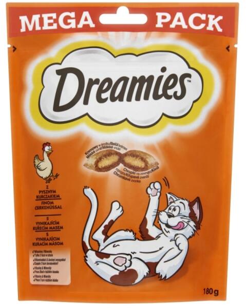 Dreamies jutalomfalatok csirkehússal macskák számára 180 gDREAMIES az ellenállhatatlan jutalomfalatka, amit a macskája imádni fog. A DREAMIES a spontán szórakozást és a szikrázó játékosságot nyújtja minden nap. Hisszük, hogy macskával élettelien vidámak lehetnek a mindennapjaink. Szeretjük macskánk egyedi személyiségét és függetlenségét - a DREAMIES jutalomfalatka kit