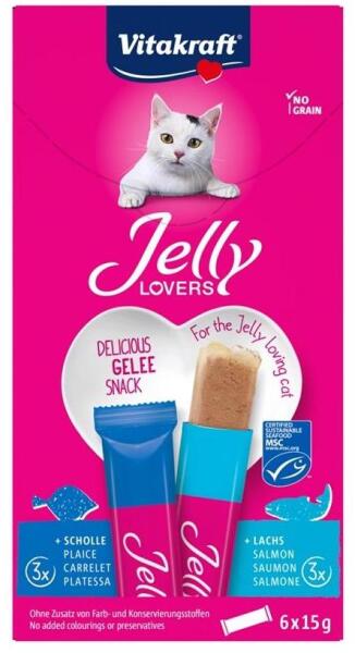 A Jelly Lovers kényeztető harapnivalók azoknak a cicáknak készülnek amelyek a zselé szerelmesei. Az ellenállhatatlanul krémes snack finom lazaccal készül. Adhatja közvetlenül a csomagolásból, vagy feltétként a normál eledelhez. Összetétel: Hús és állati származékok, hal és halszármazékok (lazac 14%), ásványi anyagok.