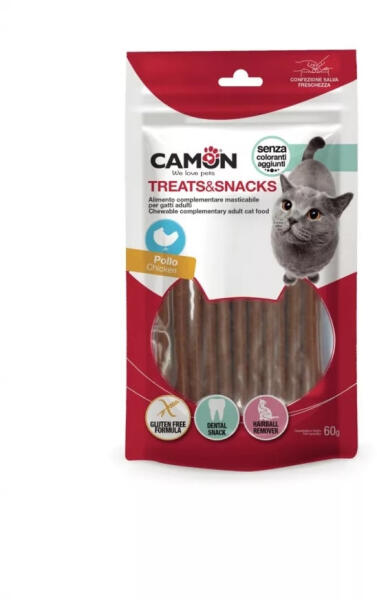 Csirkés rudak macskáknak (60 gramm). Étrendkiegészítő jutalomfalat felnőtt macskák számára, glutén és színezék mentes. ÖSSZETÉTEL: csirke 48% (hús 45% - máj 3%), édesburgonya, borsó keményítő, glicerin (növényi), szárított sörélesztő, kalcium-karbonát, nátrium-tripolifoszfát 0,2%, nátrium-polifoszfát 0,1%, Cichorium intybus L. inulin 0,03%, mannán-oligoszacharid