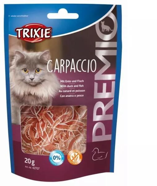 Premio Carpaccio Kacsával és Hallal Premio Carpaccio jutalomfalat kacsával és hallal. Magas hústartalmú Fehérjében gazdag Visszazárható csomagolásban Hűvös és száraz helyen tartandó! Az állat előtt mindig legyen friss, tiszta ivóvíz! Csak takarmányozási célra!