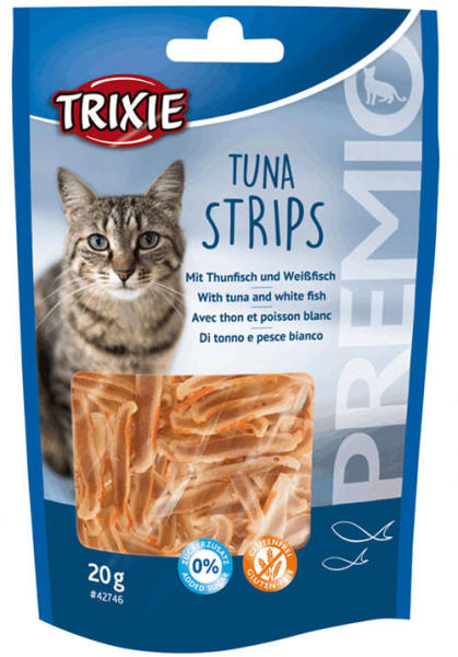 Trixie Premio Tonhal Strips további jellemzői: tonhalb l és tőkehalból készült, fehérjében gazdag jutalomfalat. 90% hal gluténmentes nem tartalmaz hozzáadott cukrot visszazárható csomagolásban