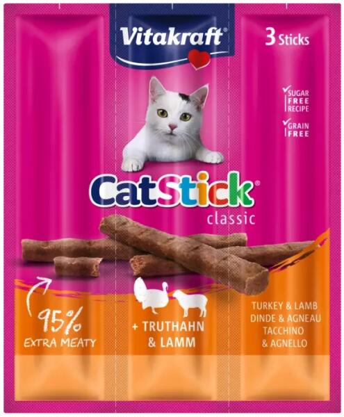 Vitakraft Cat Stick Mini Kabanosy pulyka bárányhússal 3x18g - Termékleírás A rágcsálnivalók kiváló módja annak, hogy macskánkat a jó viselkedésért jutalmazzuk. A Vitakraft kabanos magas hústartalma miatt különösen szívesen fogyasztják a finomságokat. A pálcikák étkezések közötti snackként is adhatók. A nagyszerű ízéről ismert pulyka- és báránykabanók ideális