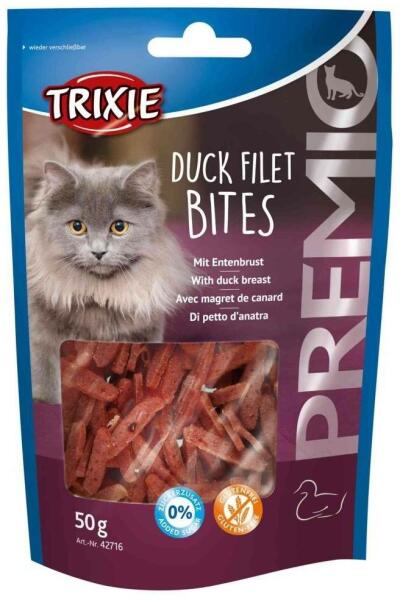 Trixie Duck Filet Bites 50g- Leírás A PREMIO Duck Filet Bites egyedülálló jutalomfalat macskáknak. A hús a termék összetételének 79%-át teszi ki. A finomság szárított krokett formájában érkezik. Egyedi íze és aromája különbözteti meg. A rágcsálnivaló előállítása során nem használnak cukrot, ami egészséges és teljesen biztonságos az állatok számára. Összeté