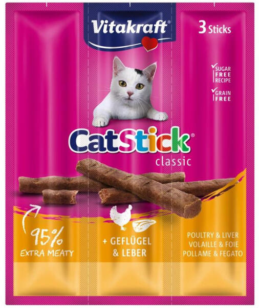 Az eredeti Cat stick! Ízletes húsrúd macskák részére extra magas hústartalommal. Összetétel: hús és állati eredetű származékok ( 75 % színhús, ebből 6% baromfihús, 6% máj ) ásványi sók. Antioxidánsokat és tartósítószert tartalmaz. Minőségét megőrzi / gyártási szám: lásd a csomagoláson Száraz, hűvös helyen tárolandó.