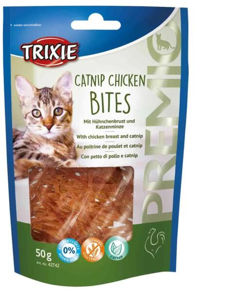 Premio macskamentás csirkemell jutalomfalatok, macskák számára. Magas hústartalommal, visszazárható csomagolásban. Gluténmentes, nem tartalmaz hozzáadott cukrot. Hűvös és száraz helyen tartandó! Az állat előtt mindig legyen friss, tiszta ivóvíz! Csak takarmányozási célra! Összetétel: csirkemell (75 %), glicerin, tápióka keményítő, macskamenta (3 %), ásványokAnalitika