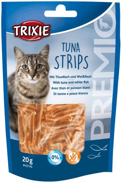 Tonhal csíkok fehérhallalKiegészítő eledel macskák számára. Összetevők: tonhal (45%), sárga tőkehal (18%), növényi fehérje kivonatok, szorbit, glicerin. Hozzáadott cukor nélkül, gluténmentes. Száraz, hűvös helyen tárolja. Analitikai összetevők: Fehérje 20%, Nyers hamu 2,7%, Nyers rost 0,7%, Nyerszsír 0,5%, Nedvességtartalom 30%. Az állat előtt mindig legyen friss tisz