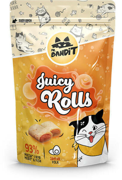 Mr Bandit szaftos tekercs tojássárgájával 40g A Mr Bandit Juicy Rolls nedves krokett ízletes tojássárgájával töltött, nedves tekercs. A puha és aromás falatok remek motivációt jelentenek a cicás csibészeknek a hancúrozásra! Összetétel: Elemzés: A szendvicsek összetétele: A szendvicsek összetétele: 1: