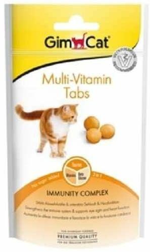 GimCat Multi-Vitamin TabsKiegészítő állateledel macskák számára, vitaminokkal. Elérhető kiszerelés: 40 gJellemzők:A GimCat Multi-Vitamin Tabs számos fontos vitamint és értékes béta-glükánt tartalmaz, melyekegyütt erősítik és támogatják a macskák immunrendszerét. A taurin hozzájárul a látáshoz és a megfelelő szívműködéshez. Gabona- és cukormentes. Összetétel: