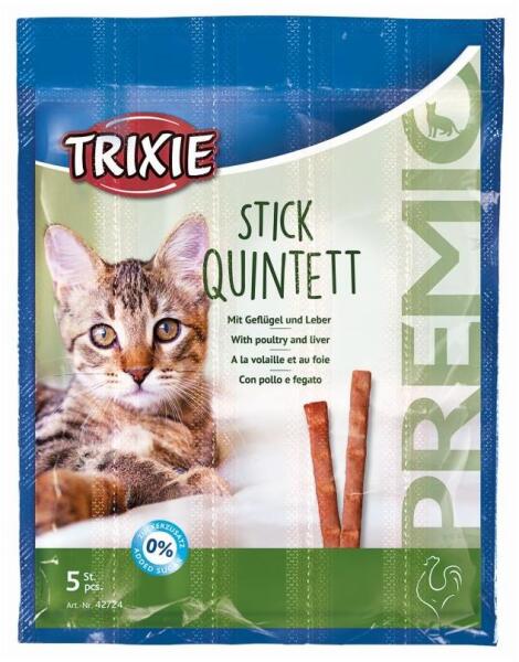 42724 PREMIO Quadro-Sticks Anti-Hairball snack, 4x5gKiegészítő eledel macskák részére. Gátolja a szőrlabdák képződését. Összetétel: hús és állati eredetű származékok (szárnyas 6%, máj 6%), ásványi anyagok. Analitikai alkotórészek: nyersfehérje 33,5%, nyerszsír 20,0%, nyershamu 9,0%, nyersrost 2,0%, nedvesség 28,0%. Adalékanyagok: Technológiai adalékanyaok: tartós