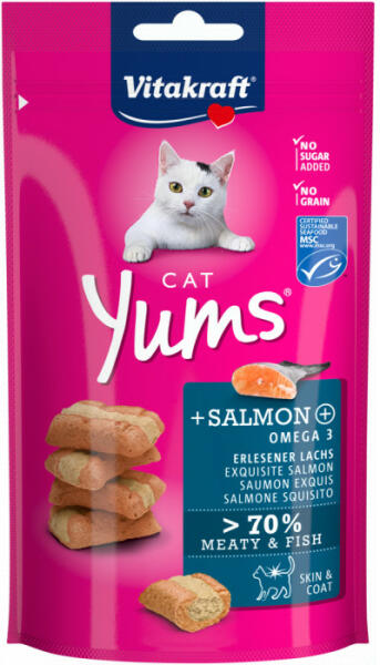 A finom lazacot és az omega 3 zsírsavakat egyedülálló eljárással állítják elő – a legjobb alapanyagokból, cukor, gabona és szója hozzáadása nélkül. Mitől olyan különleges: minden harapnivalót finoman töltenek és kíméletesen sütnek a sütőben . Ettől nem csak ellenállhatatlanul finom, hanem beleharapva lédús is. A macskája imádni fogja ezeket a húsos falatokat!