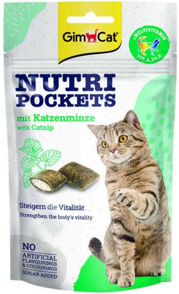 A GimCat Nutri Pockets macskamentás ropogós párnák finom töltelékkel. A-, D3- és E-vitamint tartalmaz, amelyek erősítik a szervezet immunrendszerét. Nem tartalmaz mesterséges aromákat és színezékeket, ahogy hozzáadott cukrot sem. Összetétel: gabonafélék, hús és állati származékok, olajok és zsírok, növényi fehérje kivonatok, növényi termékek (szárított macskament