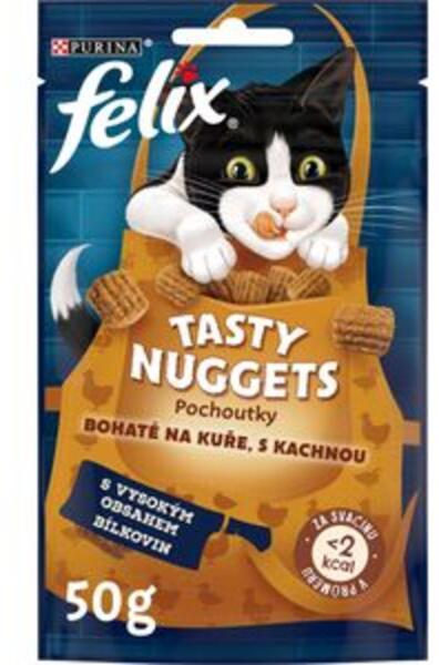 Teljes értékű állateledel macskák számáraVálaszd a magas fehérjetartalmú Felix Tasty Nuggets jutalomfalatot csintalan cicád számára Cicád imádni fogja kétféle ízvilágukat Érdes textúrájának köszönhetően még természetesebb és mesterséges színezékeket sem tartalmazElragadó ropogós textúrájával valamint ellenállhatatlan csirke és kacsa ízével élvezetes pillan