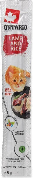 Puha bárányos és rizses jutalomfalat pálcika macskáknak, 4 hónapos kortól. A, D3, E vitamint és taurint tartalmaz. Összetevők: hús és állati termékek (12% bárány), gabonafélék (4% rizs), élesztő, cukor, ásványi anyagok, növényi eredetű melléktermékek. Etetési utasítások: 4 hónapos kortól: 1/2-1 pálca naponta, felnőtt macskáknak: 1-2 pálca naponta. Nettó súly: