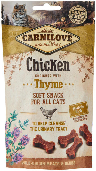Ízletes, puha, csirkés snack minden macskának. Kakukkfűvel kiegészítve, mely segít a húgyutak tisztításában. Gabona- és burgonyamentes kiegészítő táplálék macskák részére. Összetétel: 40% szárított csirke, sárgaborsó, folyékony növényi keményítő, csirke húslé, baromfimáj szósz, kollagén, 1% kakukkfű, lazacolaj. Analitikai összetevők: nyersfehérje 34,0% zs