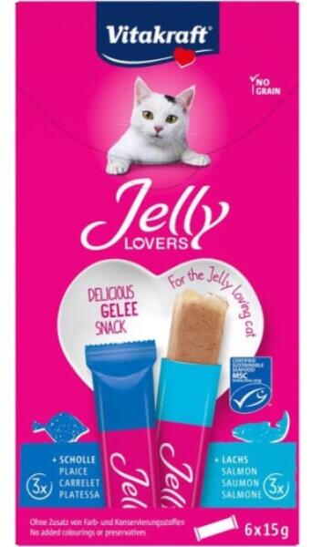 A Jelly Lovers kényeztető harapnivalók azoknak a cicáknak készülnek amelyek a zselé szerelmesei. Az ellenállhatatlanul krémes snack finom lazaccal készül. Adhatja közvetlenül a csomagolásból, vagy feltétként a normál eledelhez. Összetétel: Hús és állati származékok, hal és halszármazékok (lazac 14%), ásványi anyagok.