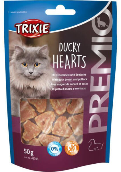Ízletes, kacsás-lazacos, puha falatkák macskáknak, visszazárható tasakban, minimum 80%-os hústartalommal. Ideális túlsúlyos, speciális diétán tartott macskák jutalmazására is, két etetés között. Nem tartalmaz hozzáadott cukrot! Összetétel: kacsamell (65 %), lazac (18 %), szójafehérje, burgonyakeményítő, glicerin, szorbit, ásványi anyagok