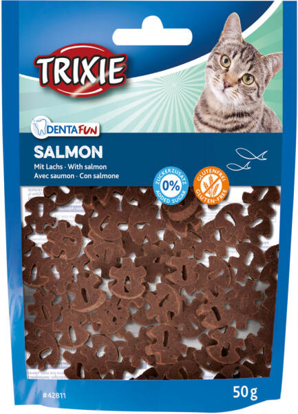 Fogápolásban segítő lazacos jutalomfalat macskák részére Különleges formájának köszönhetően segít a fogtisztításban. Összetétel: hal és hal eredetű származékok (4% lazac), hús és állati eredetű származékok, kukorica keményítő, szójababpor, növényi származékok, zselatin, élesztők, sárgarépa, halolaj, ásványi anyagok.