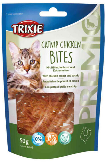 Premio macskamentás csirkemell jutalomfalatok, macskák számára. Magas hústartalommal, visszazárható csomagolásban. Gluténmentes, nem tartalmaz hozzáadott cukrot. Hűvös és száraz helyen tartandó! Az állat előtt mindig legyen friss, tiszta ivóvíz! Csak takarmányozási célra! Összetétel: csirkemell (75 %), glicerin, tápióka keményítő, macskamenta (3 %), ásványok Analitik