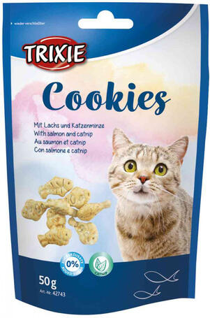 50g A Trixie Cookies jutalomfalat macskáknak, egy ropogós kis jutalomfalat halacska formájú tonhalból és macskamentából.