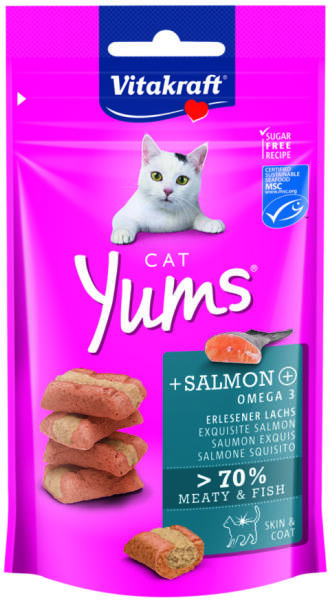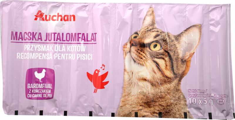 Puha, szaftos jutalomfalat kiemelkedően magas hústartalommal. Kiegészítő eledel macskák részére. Összetétel: hús és állati eredetű származékok 76,4%, zöldségek, növényi eredetű származékok, hal és hal származékok ( lazac 3%), élesztő, magvak 0,44%, ásványi sók. Tartósítószert, anioxidánsokat és színezéket tartalmaz. Minőségét megőrzi / gyártási szám: l
