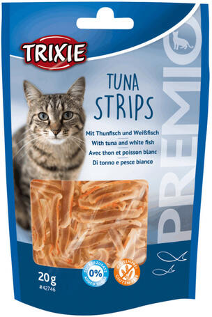 100g A Trixie tonhalcsíkok fehérhallal macskáknak egy tonhalban és fehérhalban gazdag és ízletes jutalomfalat a német Trixie-től. 90%-os haltartalommal bír. Gabona- és gluténmentes, valamint hozzáadott cukrot nem tartalmaz. Visszazárható csomagban.