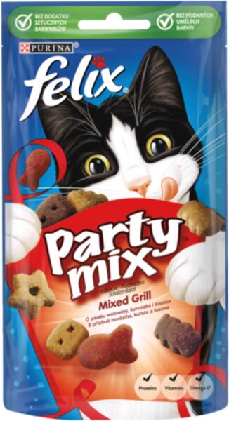 FELIX PARTY MIX Mixed Grill macska jutalomfalatÖSSZETÉTEL Hús és állati származékok 34 gabonafélék olajok és zsírok növényi fehérjekivonatok ásványi anyagok különféle cukrok élesztő hal és halszármazékok 1 50 rehidratált hús és állati származéknak felel meg melyből 10 csirke és 05 marha egyenértékű 2 rehidratált hal és halszármazékkal melyből 05 lazacADALÉK