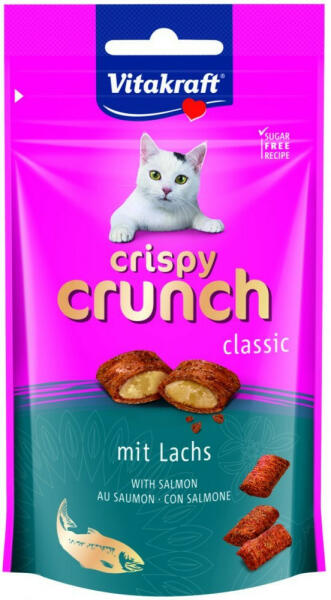 Ropogós szórakozás, amiben minden megvan! Az ellenállhatatlanul ropogós lazacpárnák csodálatosan krémesek, ezért macskája nassolásának abszolút fénypontja. Ideális kis jutalomnak vagy szeretetteljes kényeztetésnek az étkezések között. Zöldséggel és hússal készült finomság, úgynevezett szuperélelmiszerek - azaz kivételesen tápláló összetevők - töltelékével. E