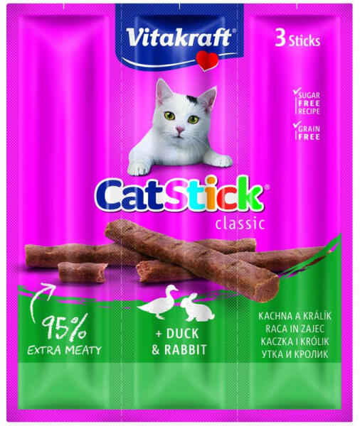 Vitakraft Cat Stick Jutalomfalat Mini Nyúl & Kacsa 3x6g Az eredeti Cat stick! Ízletes húsrúd macskák részére extra magas hústartalommal. Összetétel: hús és állati eredetű származékok 95% ( 75% színhús, melyből 6% nyúlhús, 6% kacsahús, ) ásványi sók. Antioxidánsokat és tartósítószert tartalmaz.