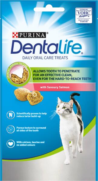 Ropogós falatkák, ízletes töltelékkel, kiegészítő állateledel macskáknak. Cellulóz alapú tisztító részei hozzájárulnak a felrakódott pakkok fizikai koptatásához és azok újbóli kialakulásának csökkentéséhez. Felhasználási útmutató : Mindig biztosítson friss ivóvizet. Naponta legfeljebb 20 db adható. Összetétel : Gabonafélék, hús és állati származékok (4%