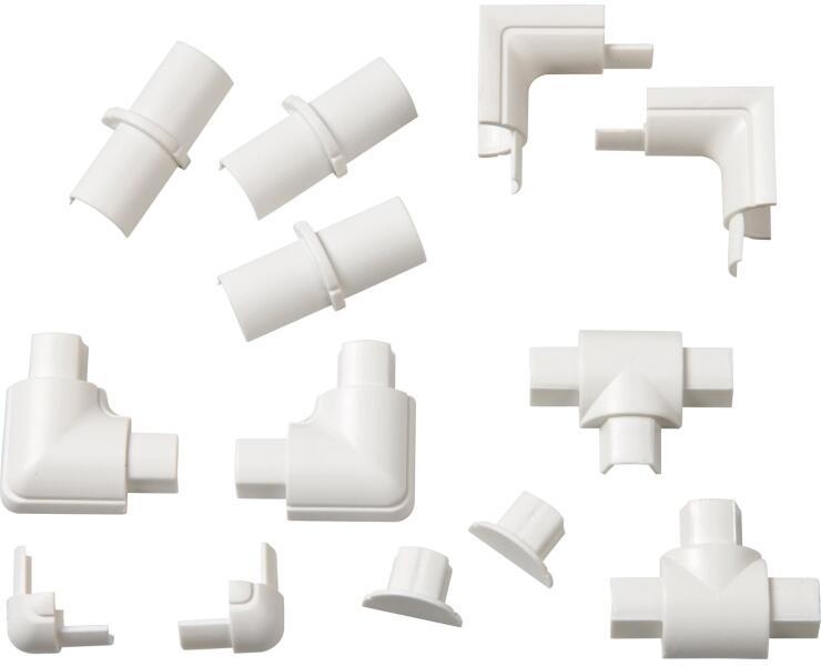 A 16 mm x 8 mm-es, fa megjelenésű D-Line tartozékkészlet 13 részes, tartalma: - 2 db belső szögelem belső sarkok összekötésére - 2 db külső szögelem külső sarkok összekötésére - 2 db 90°-os szögelem két hossz összekötésére - 2 db végelem a nyitott végek szép lezárására - 2 db T-adapter három csatorna összekötésére - 3 db hosszabbító elem két csatorna össz