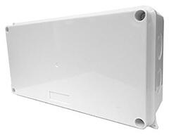 Sima falú kötődoboz csavaros fedéllel elágazódoboz vezetékek összekötéséhez, elektromos csatlakozások kialakításához belső mérete: 24,5x18,9 cm falon kívüli kötődoboz fali/mennyezeti szereléshez segítségével IP65 védettség alakítható ki csavaros tetejű világosszürke színű