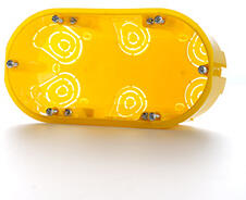 Szerelvénydoboz gipszkartonba süllyeszthető 2-es Gipszkartonba süllyeszthető, sorolható, rögzítő csavarokkal, univerzális perforációkkal, széles peremmel, mélyítve. sablon:jangar_gipszkarton_doboz
