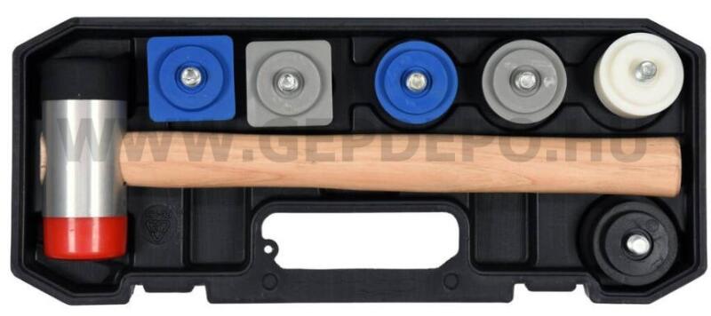 Yato illesztőkalapács készlet cserélhető fejekkel - 8 részes Összeszerelő kalapács 8 különböző keménységű cserélhető heggyel. Strapabíró PI, PUR anyagból készült hegyek. A kalapácsfej alumínium alapú ötvözetből készült. 320 mm hosszú fa nyélre szerelve. A készlet 42,5 mm átmérőjű kerek hegyeket és 43x43 mm szögletes hegyeket tartalmaz. A rendelkezésre áll