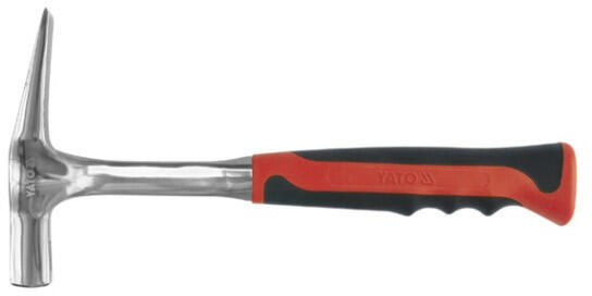 Kőműves kalapács, rajnai típusú, Súlya 600 g. Monolitikus felépítés. Rendkívül tartós. A szár és a tengely egy darab szénacélból kovácsolt, edzett és temperált. Profilozott, csúszásmentes műanyag sapkával védett. Széles, hegyes acélszár a vakolat hatékony forgácsolásához, téglák átvágásához stb. Rendeltetésszerű használat / alkalmazás Professzionális ép