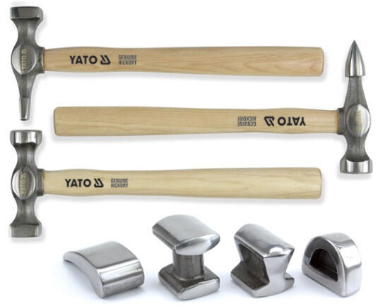Alapvető szerszámkészlet bádogosok számára. Három kalapács különböző profilú szárakkal, hikorifa nyélre szerelve, négy acélformával a fémlemezek profilozásához. Hidegen kovácsolt, csiszolt és polírozott. Készlet műanyag tokban. Rendeltetésszerű használat / alkalmazás Lemezek kézi alakításához, autóipari műhelymunkákhoz vagy tetőfedő munkákhoz. Műszaki adato