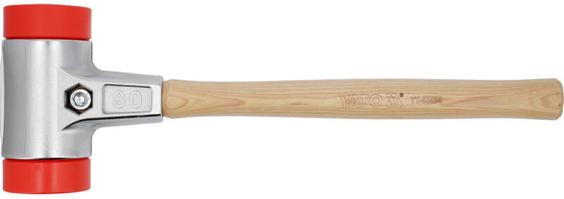 YATO YT-45484 kalapács hikkori nyéllel és két fém burkolatban rögzített gumi ütőfejjel. Az UPE anyag használata nagyon nagy tartósságot, kopásállóságot és sok vegyszerállóságot biztosít. hickory fogantyú fejátmérő: 80 mm fejhossz: 180 mm teljes hossz: 550 mm súlya: 2870 g hozzáillő pótelemek: YT-45489 tengely, YT-45494 fejek