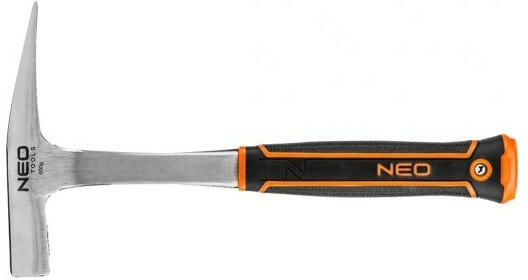 A 600 g-os NEO kőműves kalapács (cikkszám: 25-105) keskenyebb, hosszú, lapos végű fejjel különbözik más típusoktól, mivel ez a rész végső soron téglatörésre szolgál. A masszív, egy anyagból kovácsolt szerkezet acél, a szár indukciósan edzett és lézerrel csiszolt. Az ergonomikusan kialakított, csúszásmentes anyaggal borított műanyag fogantyú biztosítja a biztonsá