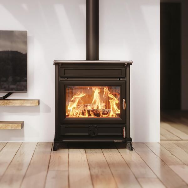 Kandallókályha előnyei: alkalmas alacsony energia igényű házakba masszív, tartós, öntöttvas rács különálló hamutartó a kényelmesebb tisztítás érdekében szilárd, masszív kályhatest matt fekete színben samott tűztér modern félkör ívű üveg forgatható tűztér magas hatásfok és alacsony fogyasztás felső vagy a hátsó füstcső csatlakozási lehetőség központi l