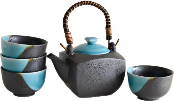 Teáskészlet a METALLIC kollekcióból, kék teáskannával és 4 csészével. A készlet tartalmaz egy fém szűrőt is.