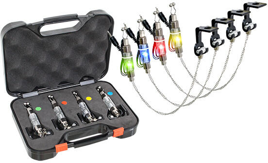 A kiváló minőségű, négy különböző színű swinger láncos változatát elegáns, és egyben tökéletes védelmet nyújtó kofferben kínáljuk. A szettben található swingerek sárga, piros, kék és zöld fényt bocsátanak ki, jól jelzik a húzós és az ejtős kapásokat egyaránt. Hibátlan, megbízható működésével a modern rádiós kapásjelzők nélkülözhetetlen egységek