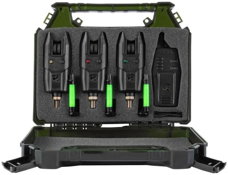 Ez a Korum KBI-R kapásjelző készlet három elektromos kapásjelzőt és egy vezeték nélküli rádiós vevőt tartalmaz. Ezen felül a készlet tartalmaz három swingert is. A KBI jelzők kompaktak és megbízhatóak. Érzékeny görgővel és fényes LED-del rendelkezik, így fantasztikus választás minden horgászathoz. A hangszóró állítható hangerővel, míg a LED 10 másodperces rias